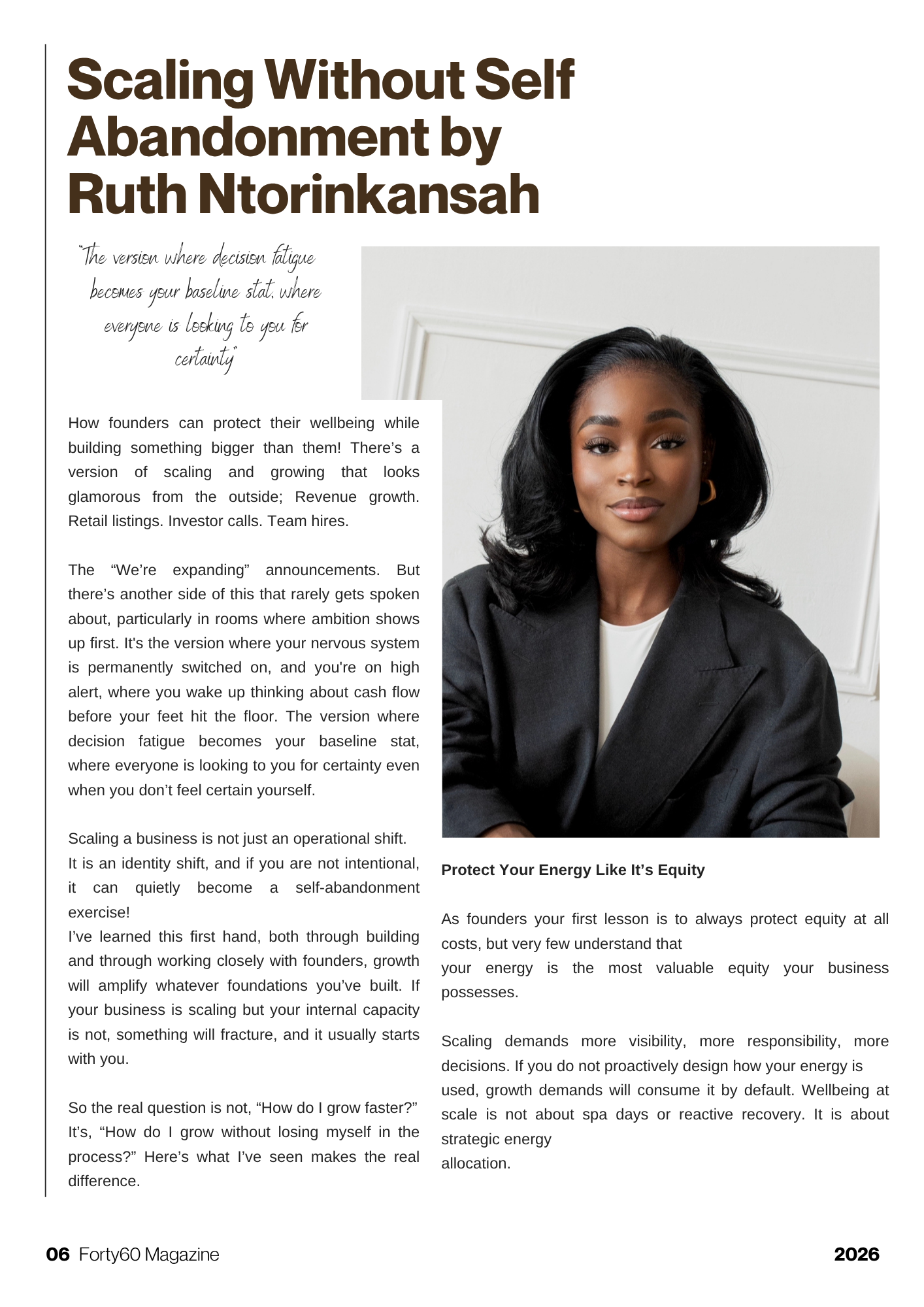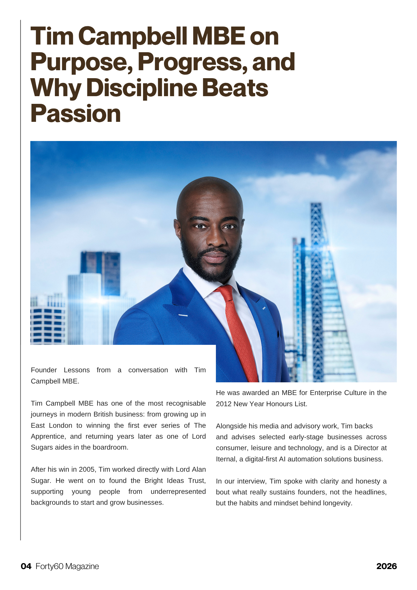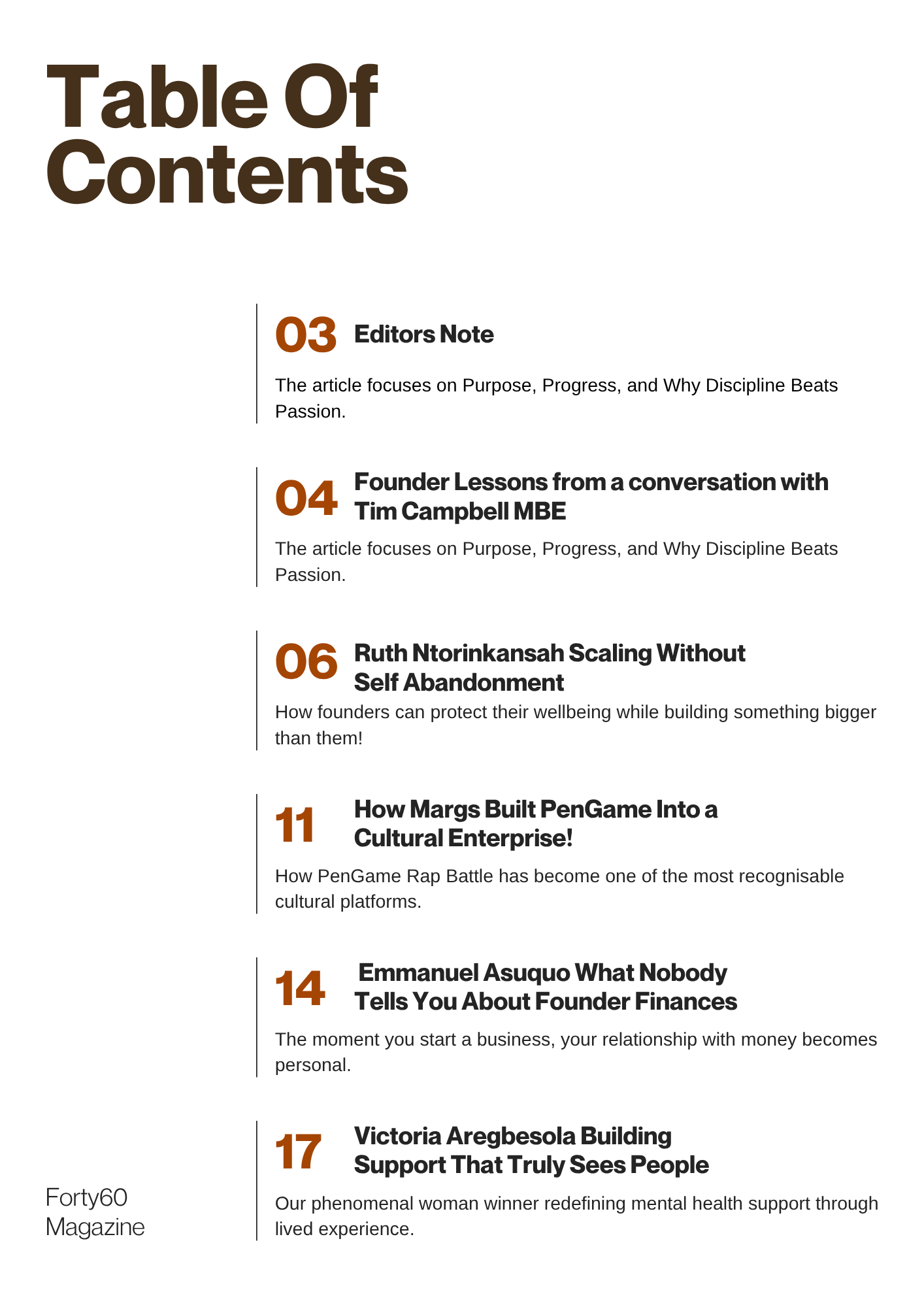 01 Issue Inside this issue of Forty60, you’re stepping into a collection of real founder stories that go beyond surface-level success. From Tim Campbell MBE unpacking discipline and longevity, to Victoria Aregbesola building impact-led support that truly sees people, each feature brings a different lens on what it means to build with intention. You’ll hear from Emmanuel Asuquo on the uncomfortable realities of founder finances, Margs founder of PEN GAME on turning culture into a structured enterprise, and Ruth Ntorinkansah on scaling without losing yourself in the process. This issue is not about hype, it’s about honesty, structure, and the mindset required to stay in the game long enough to build something that lasts.