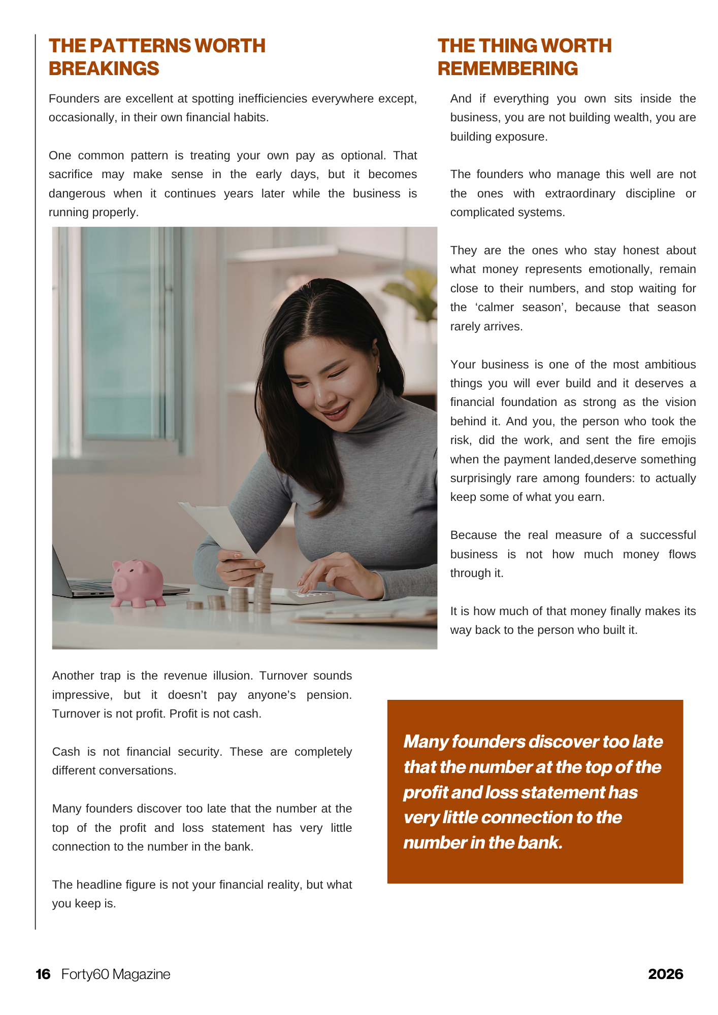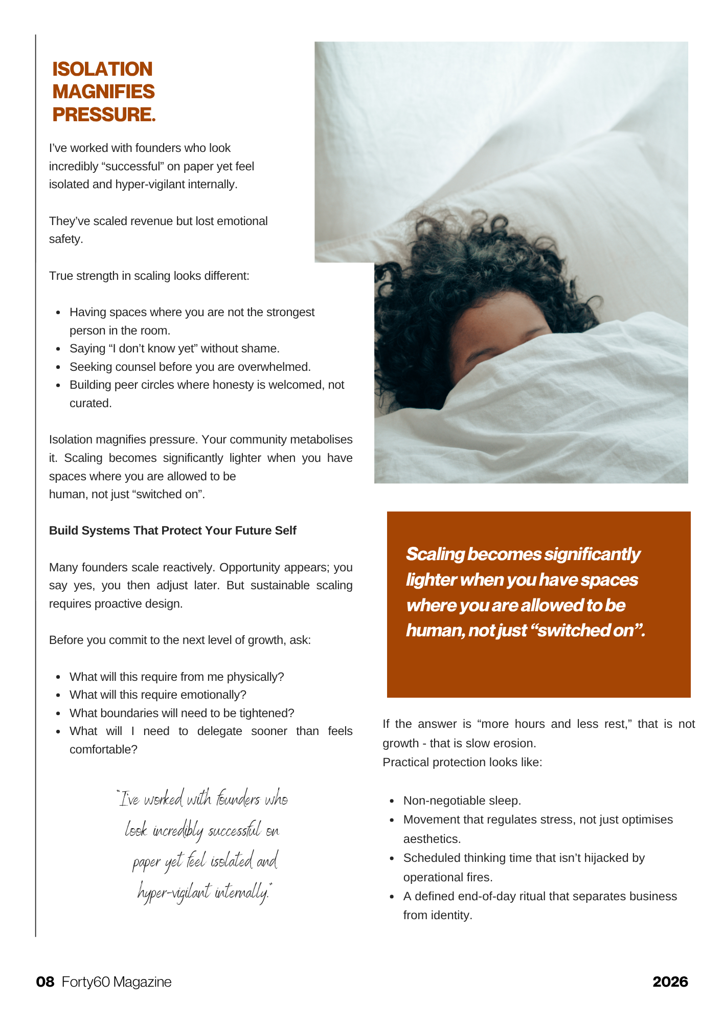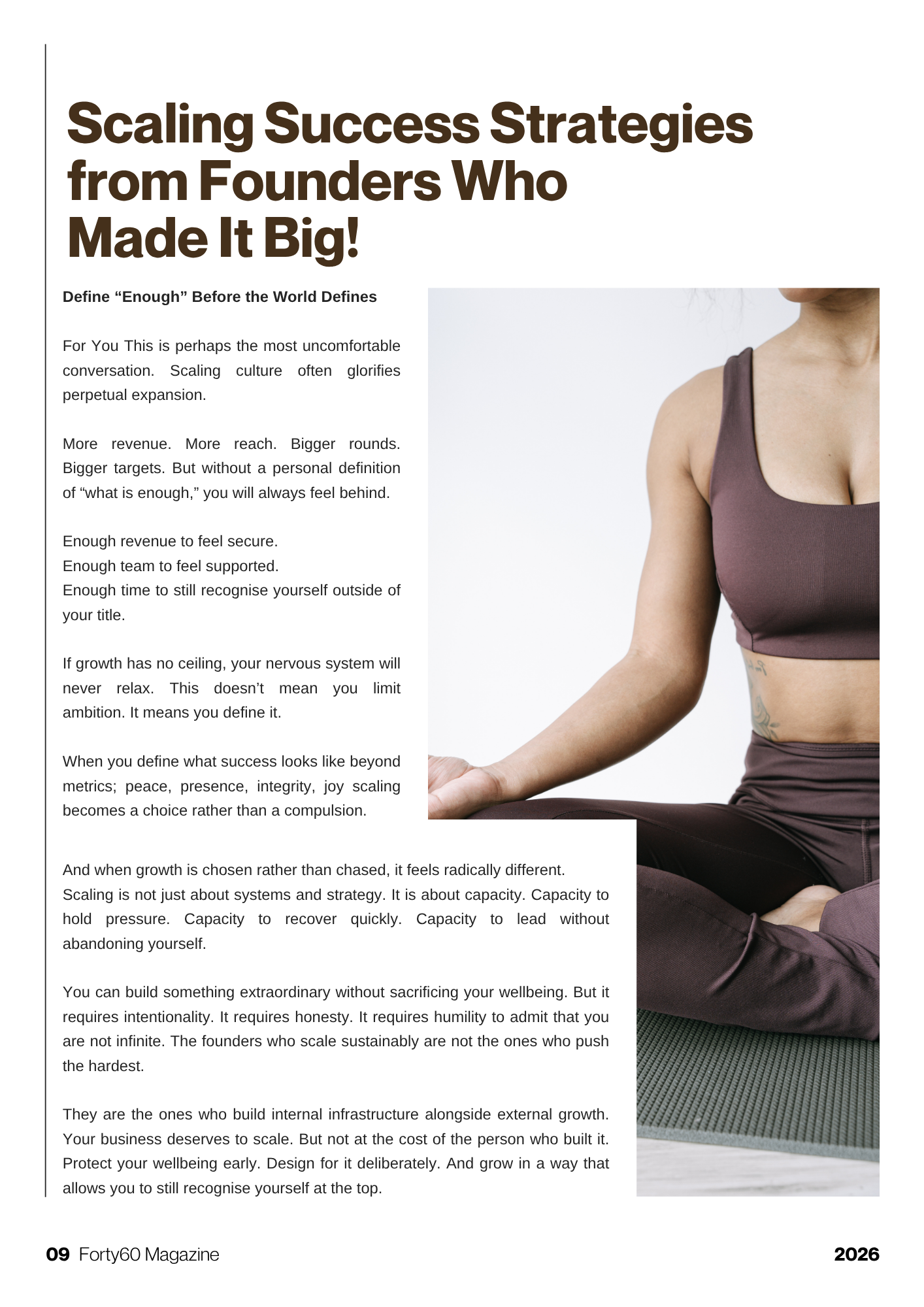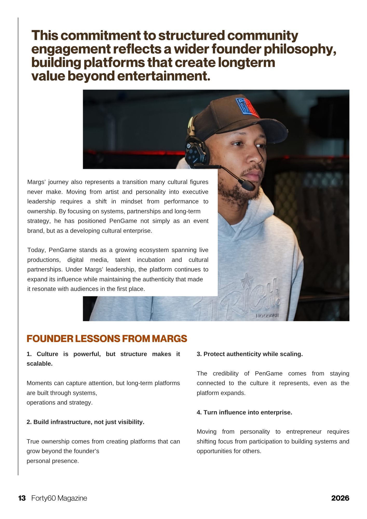 01 Issue Inside this issue of Forty60, you’re stepping into a collection of real founder stories that go beyond surface-level success. From Tim Campbell MBE unpacking discipline and longevity, to Victoria Aregbesola building impact-led support that truly sees people, each feature brings a different lens on what it means to build with intention. You’ll hear from Emmanuel Asuquo on the uncomfortable realities of founder finances, Margs founder of PEN GAME on turning culture into a structured enterprise, and Ruth Ntorinkansah on scaling without losing yourself in the process. This issue is not about hype, it’s about honesty, structure, and the mindset required to stay in the game long enough to build something that lasts.